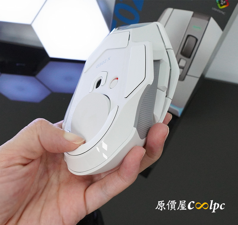 側鍵也同樣有造型,下方斜切可以更利於用拇指腹來觸發。不過這次新 G502 X 為了布置燈條,側鍵採用內縮讓側鍵上方凸出,每每操作側鍵就會碰到上方凸出的側緣,反而對於直覺觸感造成一點不適應。
