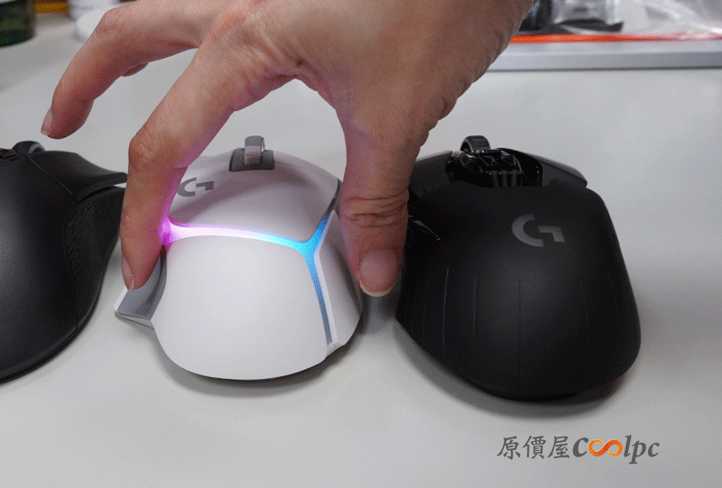 兩側面看到防滑橡膠塊,畢竟G502是一款首重於抓握感的滑鼠。側面身型弧度,前按鍵並非直落型,尾端傾斜較陡,剛好讓掌心揪起抓緊滑鼠,掌心根部底靠滑鼠尾,雙指平擺自然右傾,點擊手感相當順暢。