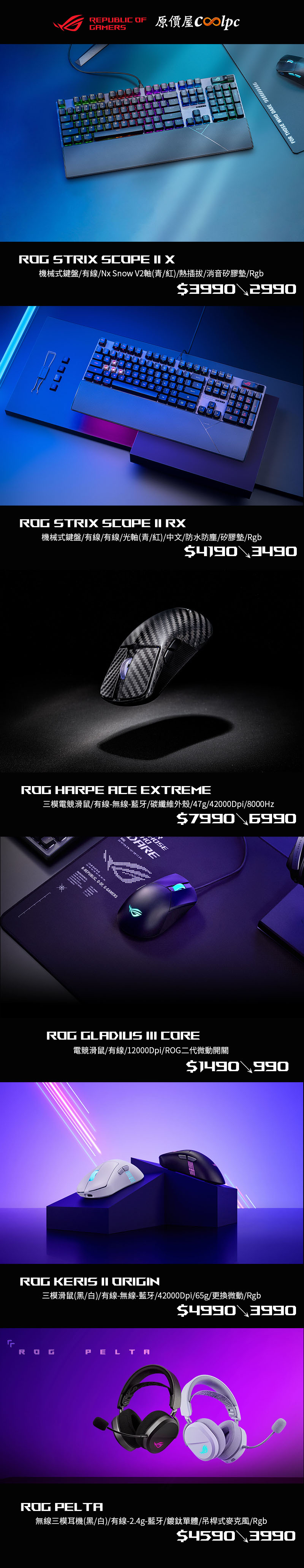鍵盤部分華碩直接端出玩家最愛、功能最全面的 ROG Strix Scope II X。原價 $3990,現在直接優惠價 $2990 就能帶走!不管你偏好線性順滑的 NX Snow V2 紅軸,還是手感清脆、段落明確的 NX Storm V2 青軸,通通支援熱插拔,內建消音矽膠墊,打字更安靜、敲擊更扎實,再加上滿滿戰鬥氛圍的 RGB 燈效,身為 ROG 迷怎能不心動?想要光軸的玩家也別錯過 ROG Strix Scope II RX,紅軸或青軸一樣通通特價 $3490,防水防塵設計搭配光速觸發,穩定度與反應速度都很有感,現折 700 元這價格真的很犯規。滑鼠這邊更是驚喜連發。華碩居然把碳纖維外殼的 ROG Harpe Ace Extreme 拿出來做優惠,47 克超輕量、最高 42000 DPI,再加上 8000Hz 輪詢率,完全就是頂規代表,原價 $7990 現在直接少一張小朋友,用 $6990 就能帶回家,對追求極致反應速度的玩家來說超有吸引力!想要高 CP 值選擇?那麼 Gladius III Core 也很香,原價 $1490 現在不用千元只要 $990,12000 DPI 搭配 ROG 二代微動,不論入門或當備用滑鼠都很適合。而 Keris II Origin 更是這次的重點中的重點,三模連線、42000 DPI、65 克輕量,還能自行更換微動,黑白兩色通通 $3990,重點是買就送 Polling Rate Booster 輪詢率加速器,再加一張 Medium 鼠墊,等於整套幫你配好,哪還有理由不升級?