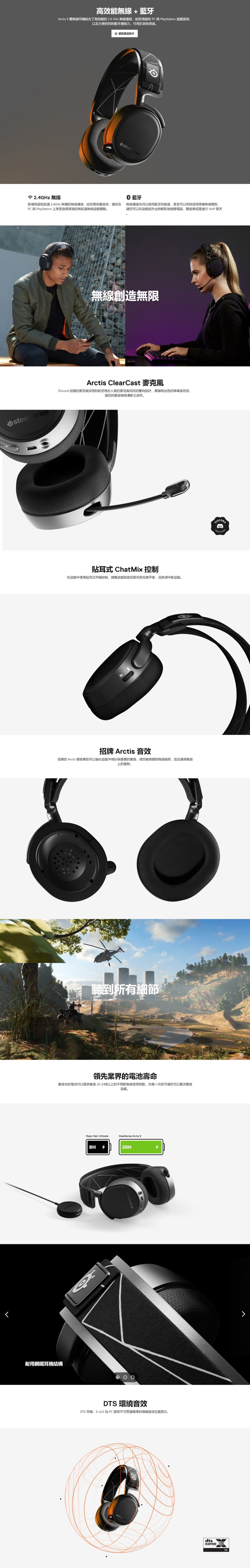 ss Arctis 9 擁有顛覆你想像的超迅速的 2.4 GHz 無線連接性能,幾乎沒有音訊延遲,可以用在 PC 以及 PS5 ..等遊戲機上帶來無延遲最真實的音效體驗,這讓許多玩家興奮不已啊~!不過最多人看上的則是2.4GHz與藍芽雙無線連接技術,遊戲進行中可以不中斷的直接以藍芽進行通話、播放音樂、VoIP聊天,一邊跟兄弟奮戰一邊女友打電話來照樣能無縫接軌,這樣隊友跟女友都不會發現!而 ChatMix 遊戲音與語音聲音的調節控制就在耳罩上(僅PC使用)。麥克風是 Discord 認證的降噪雙向設計,傳話清晰不斷訊。最棒的就是電池在充飽的狀態下能直接使用超過20小時以上的續航力唷!全台原價屋門市、原價屋蝦皮商城、原價屋線上估價頁面下單活動都同步進行中!