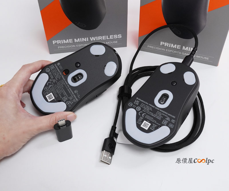 Prime 無線使用 USB-C 的接收器,也有附上轉接器唷! 採用的都是全新的柔軟超細纖維網狀纜線可減少阻力