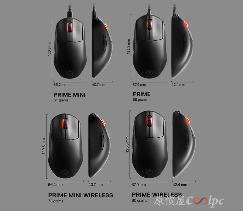 其實左右可以說是各自的縮小版本!mini 真的很輕唷,有時候就是差這麼一點點點,就影響了手感。我對 Prime 的身形手感讚譽有加,但對 mini 就更有愛了!!幾乎可說為亞洲人打造的手感,或是SS希望所有玩家都能擁有這樣一款輕量化的專業級滑鼠。
