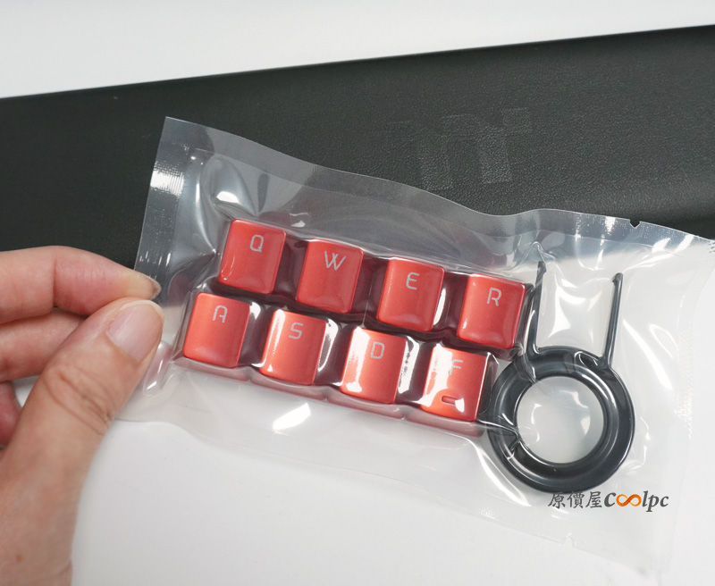 主要戰鬥區WASD QERF 的紅色鍵帽,跟簡易型的拔帽器在一次性的真空包裝裡面,就不怕拿到別人拆封過的商品了。