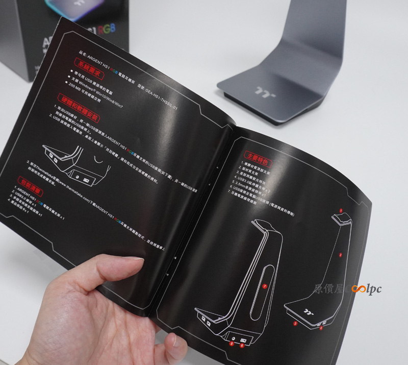 【曜越 幻銀 Argent HS1 RGB 耳機架】霸氣的耳機架,並且內建雙顆 USB 3.0 接口和 3.5mm 音源孔,當然也有RGB燈光同步囉。