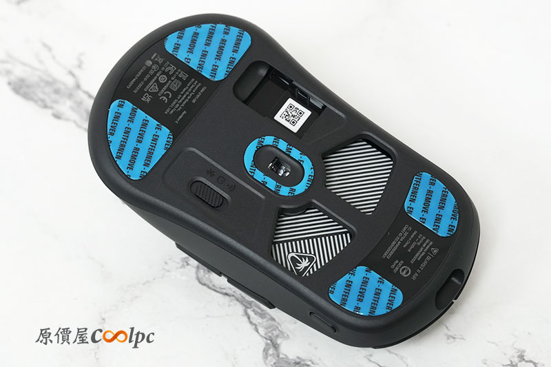 滑鼠底部採用 PTFE 腳貼,提供滑順移動體驗,並支援更換不同尺寸腳貼配置,讓玩家可依照滑動習慣調整手感。另外也有設置 USB 接收器的收納凹槽。