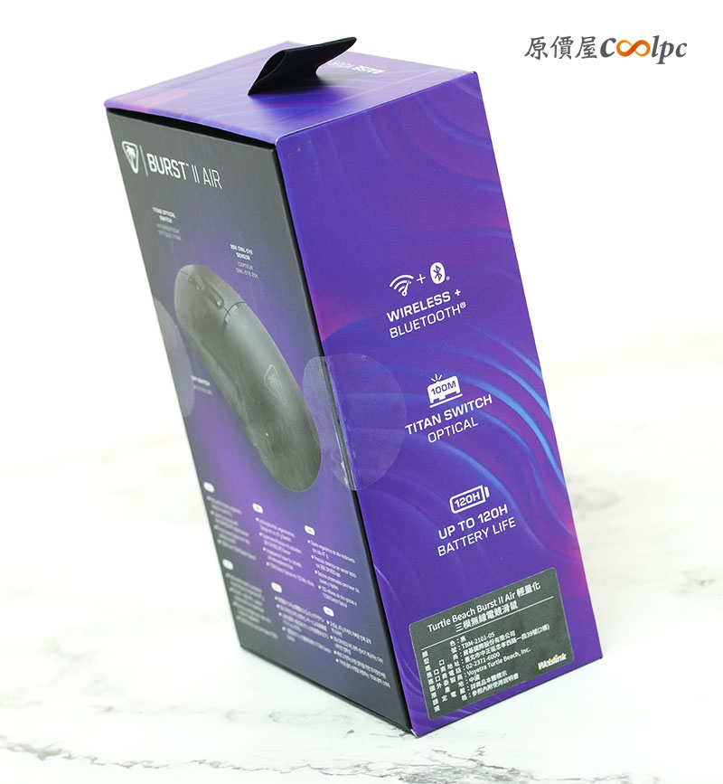 「Turtle Beach Burst II Air 輕量化三模無線電競滑鼠」的外盒採用紫黑色系設計,正面直接呈現滑鼠本體與產品名稱,整體風格走簡約科技感。側邊則標示重點規格,包含超輕量 47g、三模連線與高 DPI 感應器等特色,第一眼就能掌握產品定位。