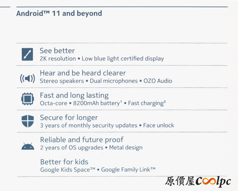 平板是10.4″ 2K解析度,SGS認證低藍光,內建雙聲道喇叭、雙麥克風,電池容量8200mAh還有快充功能,並且提供三年安全更新、臉部辨識功能,使用Android 11系統並提供兩年軟體更新,內建Google Kids Space及Google Family Link軟體。