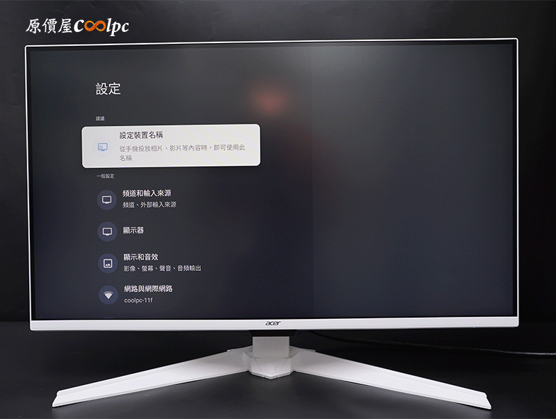 設定內有設定裝置名稱、頻道和輸入源來源、顯示器、顯示和音效、網路與網際網路、帳戶和個人資料、隱私權、應用程式、系統、無障礙、遙控器與配件、說明和意見回饋。系統為 Android TV 11,可以把它當成電視來使用,然後附加 180Hz 更新率的電競螢幕,他的設定選單已經不像是針對傳統螢幕那樣,所以像是 HDMI 和 Type-C 相容性選擇的東西會找不到。