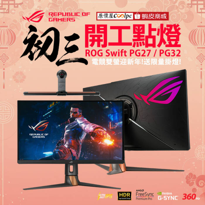 各位玩家朋友年快樂啊~今天初三是原價屋全台門市(除台南)、網路、蝦皮、產線全線的"正式"開工時間!所以各位久等的玩家朋友們,要來門市走走的今天就可以來啦!當然一樣維持每天都有活動的慣例,今天初三開工就推一檔華碩「ROG Swift PG27AQN」「ROG Swift PG32UQXR」雙螢幕的限量活動!只要現在買,就能立即獲得價值 $4688 的螢幕掛燈!當然這也是數量有限的喔!