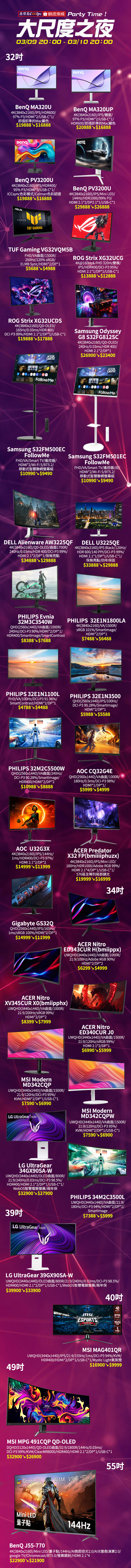 懂玩的人都知道,大的不只更好看,大的也更好用,大的用起來都有感!如果你也在追求大的刺激,就絕對不能錯過這次的「原價屋蝦皮大尺度之夜」,有各式各樣大尺寸螢幕優惠,從32吋到55吋通通有,由明碁BenQ、華碩ASUS、微星MSI、明碁BenQ、三星SAMSUNG、戴爾DELL、AOC、Philips飛利浦、ACER宏碁、Gigabyte技嘉等一眾老司機帶路,更棒的是最高折扣快$7000元,買到賺到啊!不過注意了,活動在原價屋蝦皮商城限定登場,時間從3/9 20:00~3/10 20:00限時一天,數量有限售完也可能提前結束,有興趣的朋友手速要快,錯過可就沒有囉。