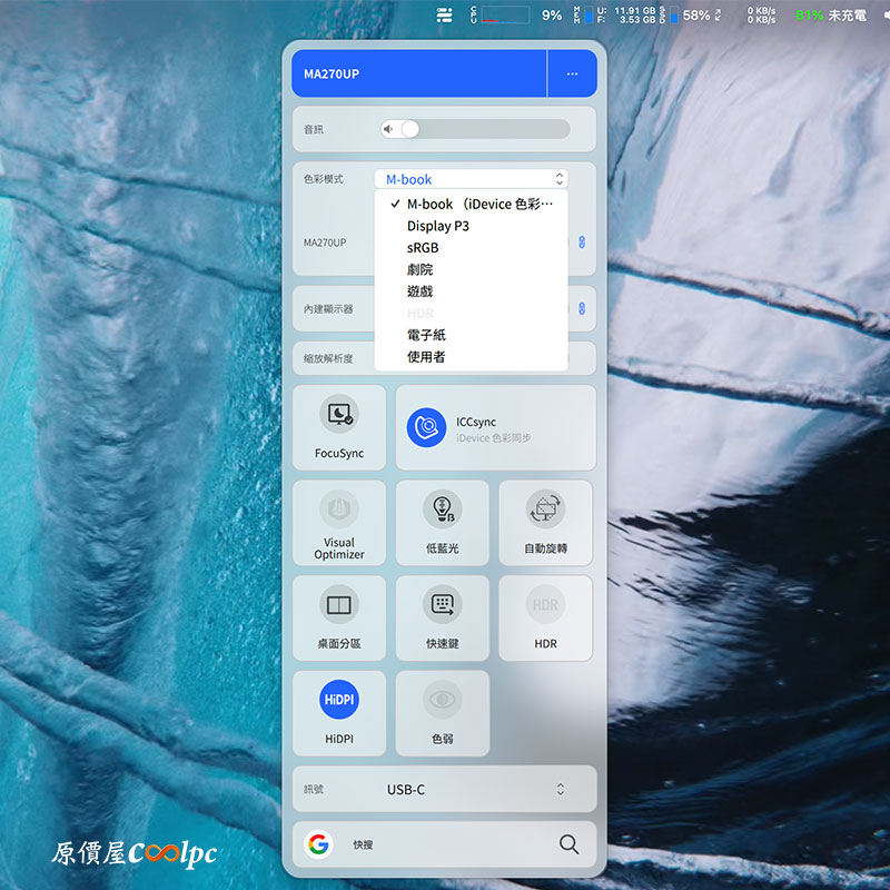 M-book iDevice 色彩同步模式開啟,外接螢幕的色彩幾乎是跟 MacBook 一樣,如果是 Apple Mac 全家統的用戶,真心推薦 Benq MA270UP 鏡面螢幕,體驗上來說真的不錯,只要不是強光直射螢幕,抗反光的效果真的不錯,BenQ MA270UP 鏡面這台也有跟蘋果 Apple Studio Display 比較(點我查看),讓用戶用一半價格可以獲得幾乎一樣的視覺效果,小編個人覺得還蠻值得投資。