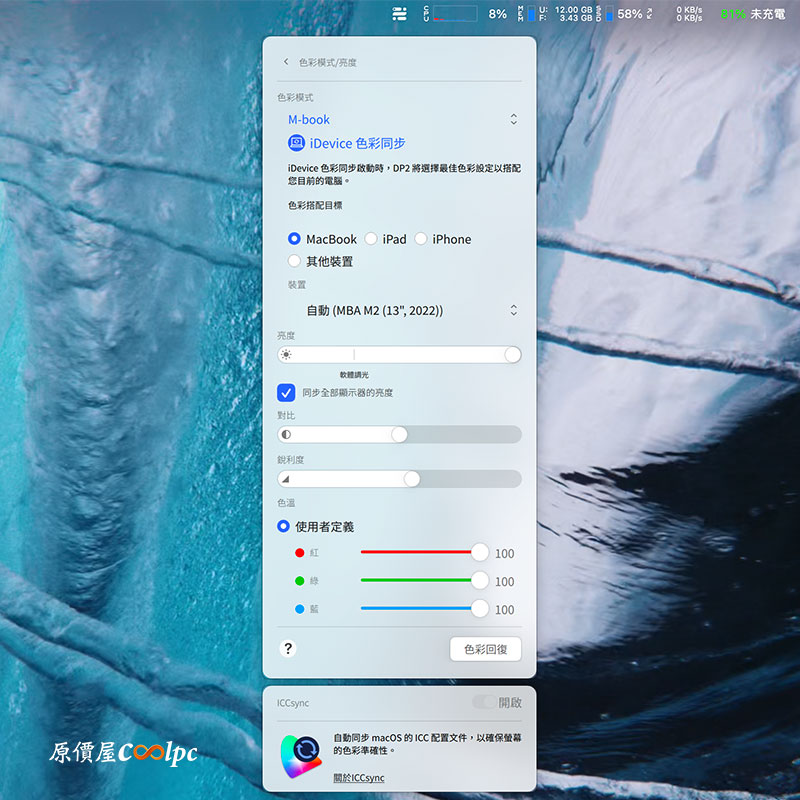 M-book iDevice 色彩同步模式內,可以看到 MacBook、iPad、iPhone、其他裝置,裝置本身會自動抓取 MacBook 筆電參數,若沒有可以自己挑選,底下可以看到是自動同步 macOS ICC 文件,確保顏色統一。