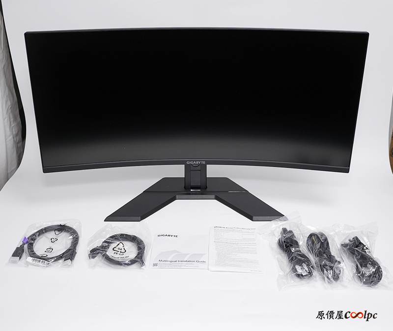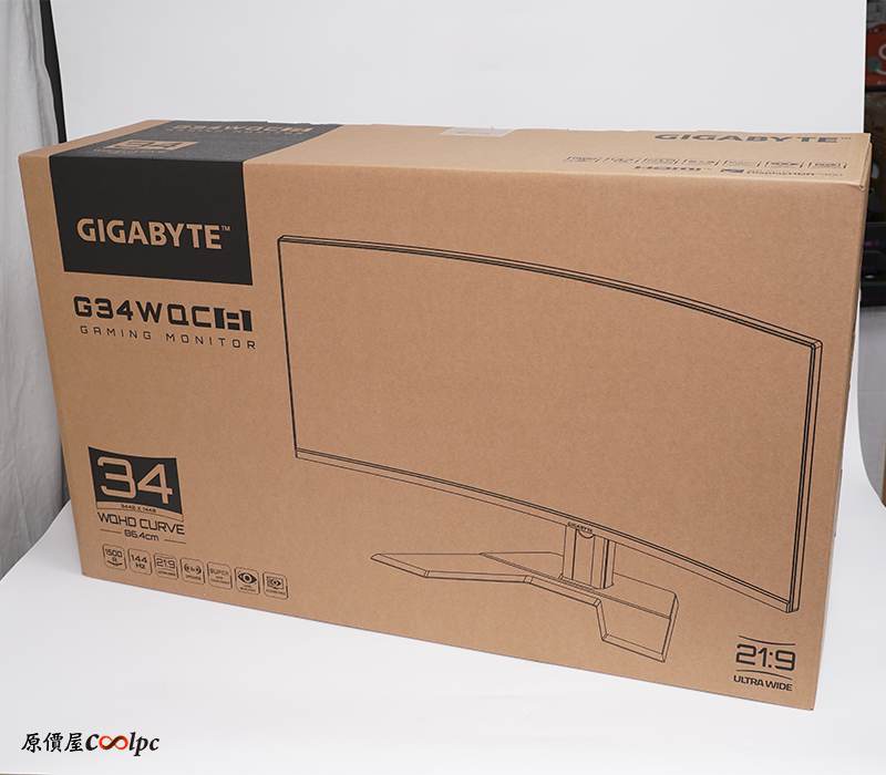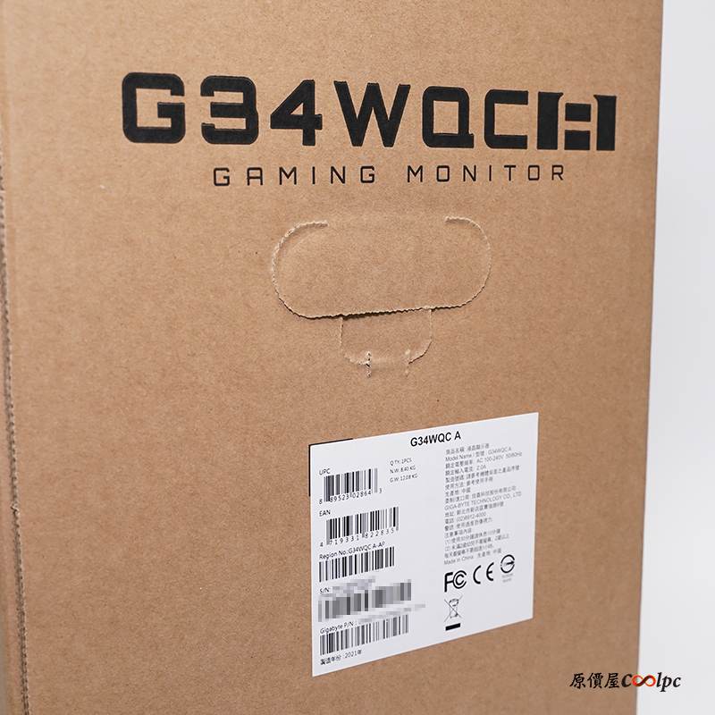 技嘉這次帶來1500R曲率、34吋(3440 x 1440解析度)、144Hz更新率、21:9比例的電競螢幕,外盒可以看到螢幕的示意圖和G34WQC A型號。