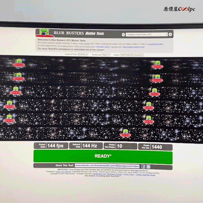 接著透過UFO TEST 網站測試螢幕更新率,確實是144Hz,慢動作下144HZ看起來是非常平順,相較其他較不會有跳格的問題。