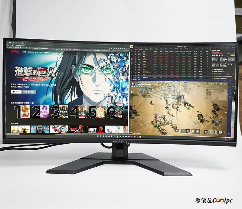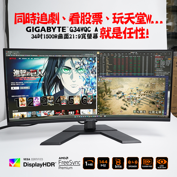【開箱】同時追劇、看股票、玩天堂W…就是任性!技嘉G34WQC A 21:9 144Hz 1500R曲面螢幕。