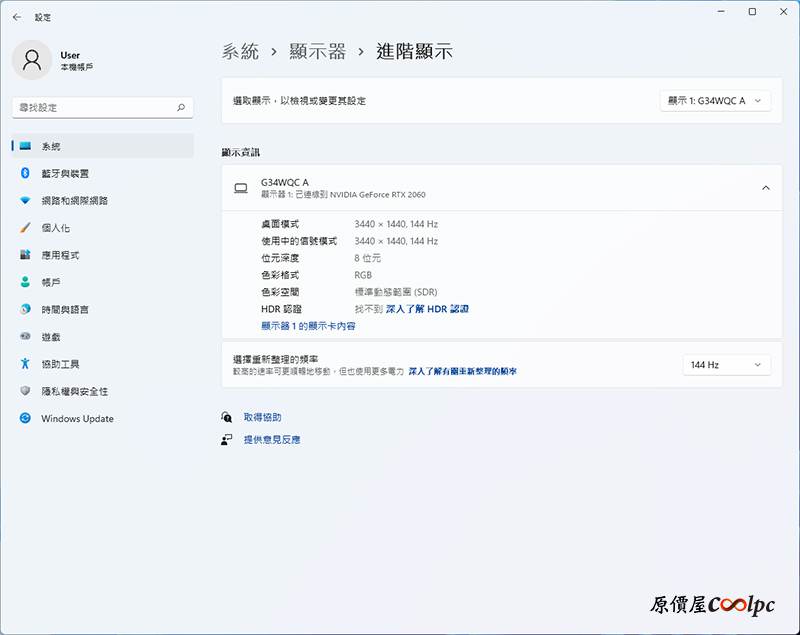 進階顯示內可以看到解析度為3440 x 1440,螢幕更新率為144Hz,8位元深度,並且支援HDR。