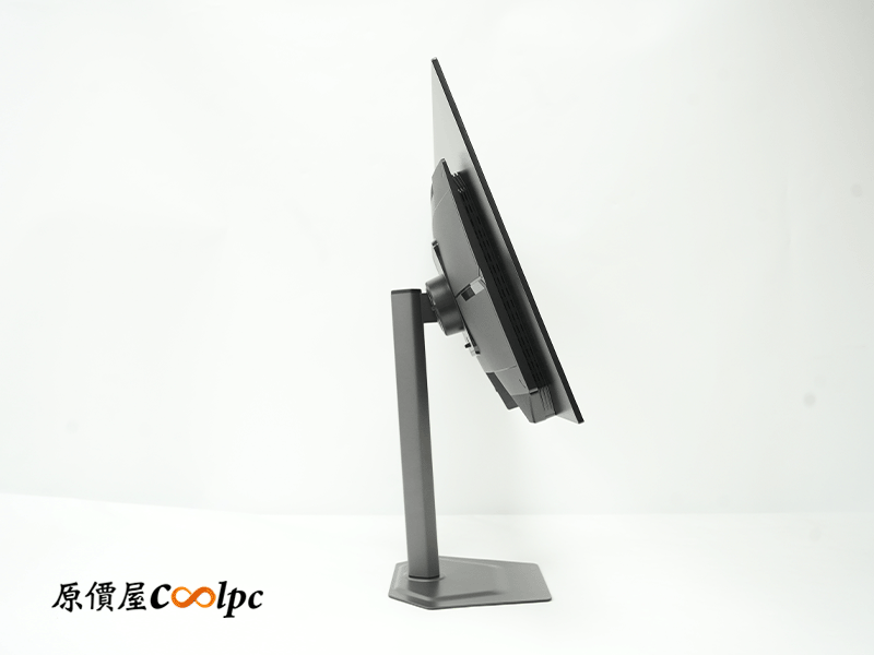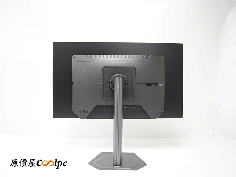 從背面看起來同樣是俐落的電競風,線條乾淨簡潔。金屬支架加上超薄 2mm 底座的組合,讓整體質感很到位,放在桌上也不會佔空間。