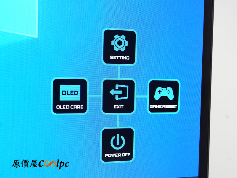 點開選單後可以看到,整體的快捷鍵布局都很貼近玩家需求,上手也很直覺。上方是主要設定,左邊是負責清除影像殘留的 OLED Care,右邊是 Game Assist 戰術輔助功能,下方則是 Power Off 電源鍵,而正中間就是離開選單。