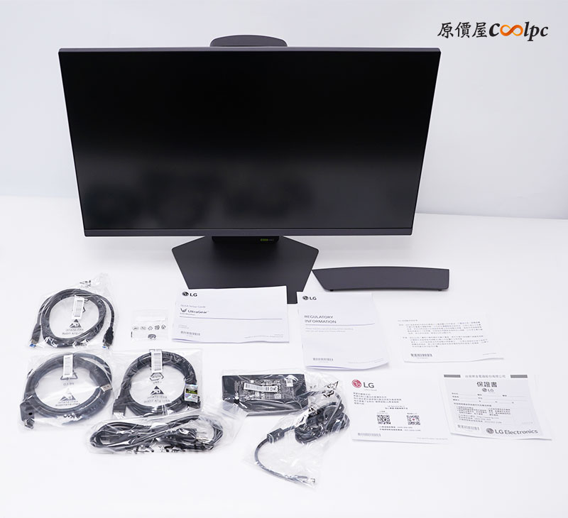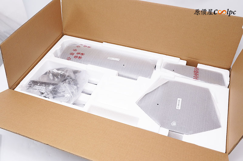 所有的配件有螢幕本體、線材遮罩、USB-A 轉 USB-B 線材、DisplayPort 2.1線材、HDMI 2.1線材、變壓器和供電線、安裝指南、保固卡等。