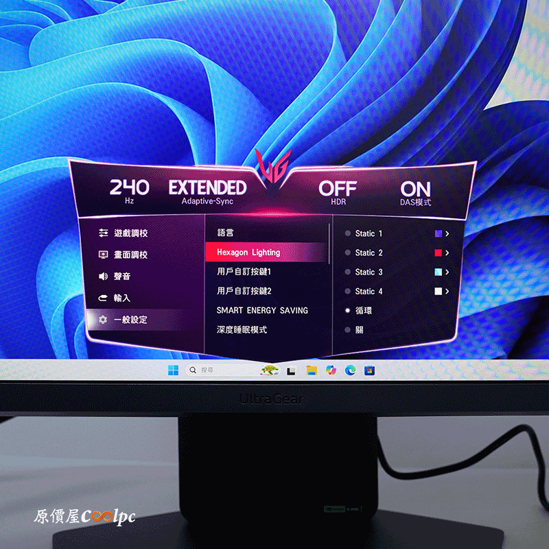 一般設定裡面有一個 Hexagon Lighting 選項,預設是關閉,打開之後螢幕背後就會有 RGB 燈光效果了。如果有碰到電腦比較老舊,訊號輸入無法相容 2.1 本版,可以把它降到 1.4 或 1.2 版本。