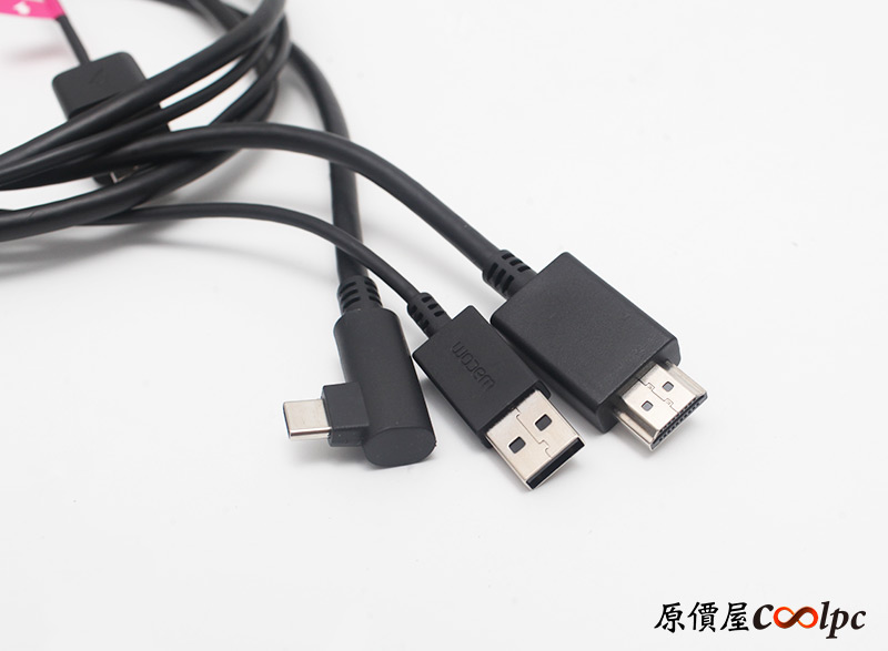 內容物2:線材組,連接變壓器這端是USB Type-A介面,有一個閃電貼紙可以辨識,線的另一頭分成三頭,USB-Type-A連接主機,HDMI連接顯卡,USB Type-C則是連接Wacom One。