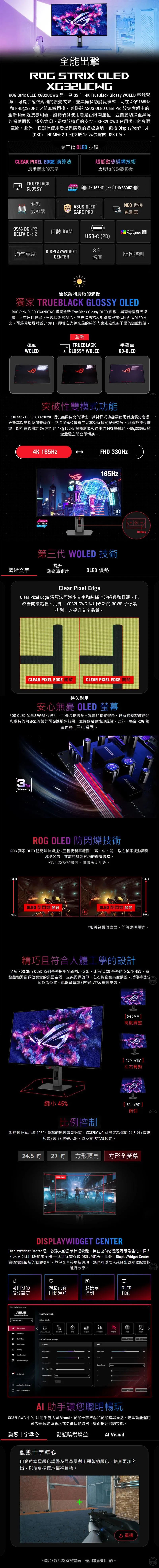 ROG Strix OLED XG32UCWG雙模電競顯示器採用TrueBlack Glossy OLED,4K 3840X2160@165Hz與FHD1920x1080@330Hz切換,0.03ms 反應時間、VESA DisplayHDR™ 400 True Black、99% DCI-P3 色域、真實 10 位元色彩以及 Delta E < 2 色差,讓你視覺體感大震撼!其他像是 USB-C (支援15W PD)+ HDMI 2.1 + DP 1.4 全接口配置,還有單一鍵盤滑鼠無縫控制兩台遊戲裝置的自動KVM功能真的很實用啊,當然那些本來就有口碑的Displaywidget Center和AI助手肯定是有的。