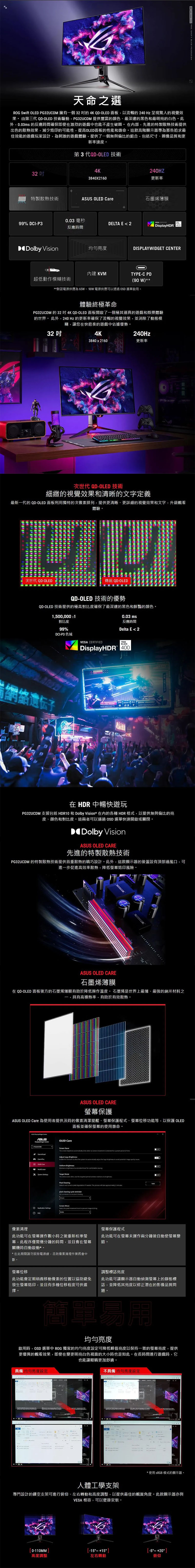 ROG Swift OLED PG32UCDM跟上面這台最大差別在於它是QD-OLED和32吋 4K@240Hz、石墨烯薄膜、90W PD USB-C和乖張的投射燈螢幕支架,背後同樣背著ROG Logo LED,其他在規格上大致相同,一樣是99% DCI-P3和Delta E < 2和 USB-C (支援90W PD)+ HDMI 2.1 + DP 1.4 當然ASUS OLED Care等一樣不少。主要還是在QD-OLED的獨特次像素排列提供更清更詳細的覺效果和文字,可以看到更多細節,讓本來就頂的OLED更極致!