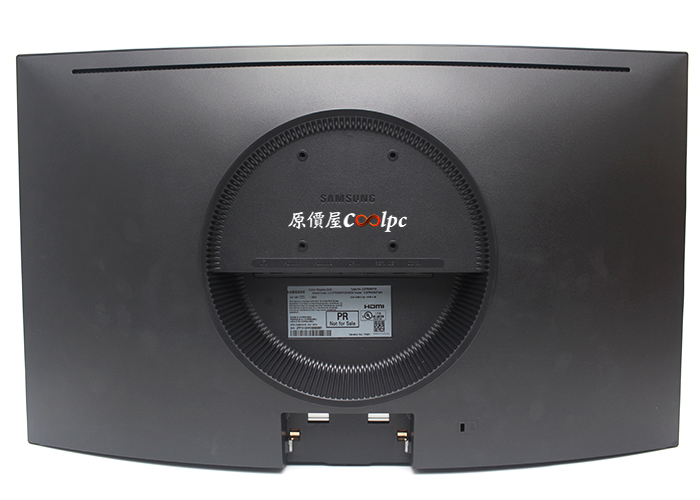 背面看上去也是個圓弧的曲面,和先前開箱過的Samsung C49J890DKE 49吋神機有異曲同工之妙阿!頂端有整排的透氣孔設計,中間區塊有75 x 75mm的壁掛孔位,再往下就是產品序號標籤部分。