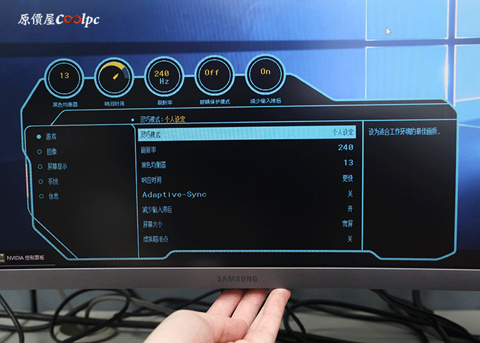 厲害的是螢幕為1500R超曲面設計,又是薄框質感,從螢幕的左下方可以看見NVIDIA G-SYNC認證!Samsung logo下方則是,五向搖桿式按鈕,結合OSD圖形介面,讓操作更直覺!