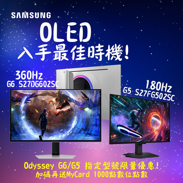 OLED 最佳入手時機!三星 Odyssey G6/G5 指定機種限量優惠,加碼再送 MyCard 1000 數位點數卡。