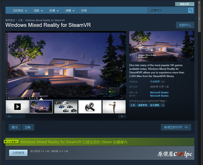 而為了讓頭盔除了使用Windows商店軟體外,也能相容Steam軟體,第一步要先安裝好Steam軟體,再到軟體商店中安裝Windows Mixed Reality for SteamVR(免費),主要是讓Steam能夠啟動MR頭盔,配合著Steam一起使用,可玩的項目更加多元!