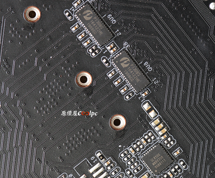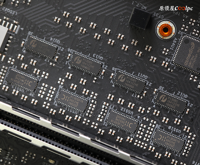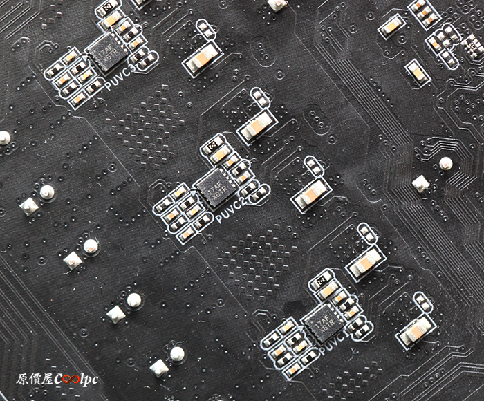 X570晶片組登場啦!資源加大,所以變得比以前大顆了也很正常啦…,採用nuvoTon NCT6796D 環控晶片,音效使用Realtek ALC1220晶片並搭配日系音效電容,Intel WGI211AT Gigabit網路晶片、其餘還有nuvoTon N76E885AT20 RGB LED控制晶片、Asmedia ASM1543 USB Type-C 偵測晶片、Diodes PI3EQX-1004 USB 3.1 Gen2 訊號中繼晶片、ASM1184e PCIe交換器晶片、多組Diodes PI3DBS16412ZHE、Diodes PI3EQX16000ZHE做為PCIe 4.0切換晶器、IDT6V4時脈產生器、GL850G USB HUB晶片、每個風扇插座還有NUVOTON 3947SA PWM電壓調節IC,使用ISL69147 PWM數位控制器搭配17AF倍頻器,SiC634 Mosfet組成14相(7倍相)供電設計、LR22電感、Nichicon 12K 黑金電容、記憶體IC採用uP1674P,提供2相供電。