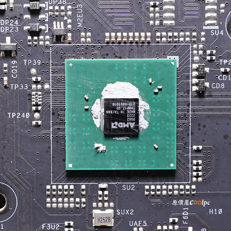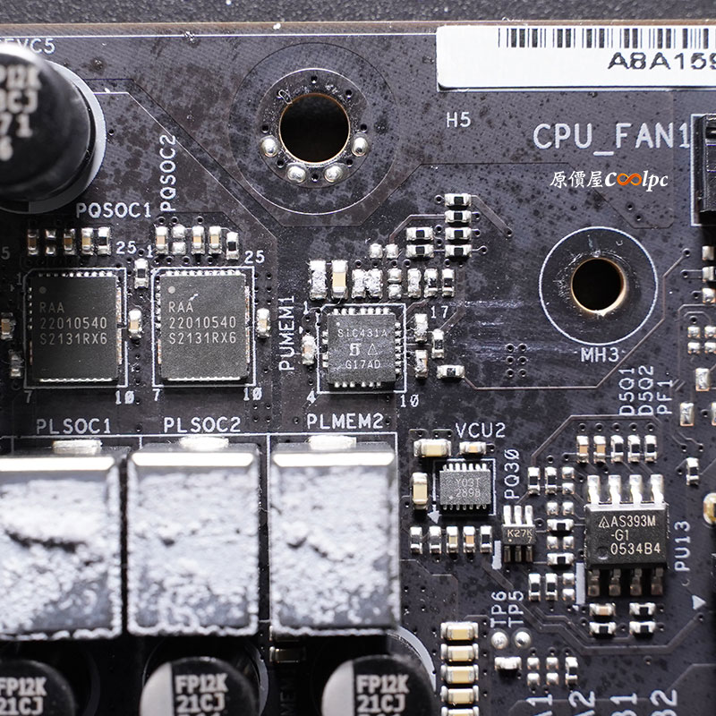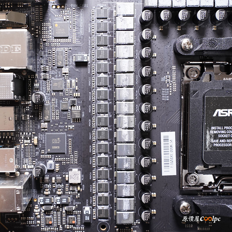 厚實的散熱片拆下來,可以看到裡面散熱片內還有一根導管連結VRAM和PCH晶片,透過散熱片內的風扇來加速散熱。供電相數為24+2+1相超嚇人的數目…,PWM控制器為Renesas RAA229628,MOSFET為Renesas RAA22010540和Sic431A,前者每相提供105安培的電流,後者60安培電流,搭配上數顆Nichicon黑色固態電容和電感,確保Ryzen9 7950X處理器有穩定和足夠的電力,網路晶片為Intel Killer E3100、USB3.2 Gen2 10Gb/s 晶片為PI3EQX1004ZHE、USB4/Thuderbolt 4晶片為intel JHL8540、Type-C PD供電為Realtek 5452E、音效部分為Realtek ALC4082晶片和ESS SABRE9218 DAC以及WIMA 音效電容組成,兩顆南橋晶片上方的處理部分USB、M.2、SATA以及音效卡、有線、無線網路,下方的則是處理部分USB和M.2、SATA,M2_1上方還有一顆 Renesas RC26008 外部時脈晶片,可以讓CPU超頻更有潛力釋放更多效能,PCIe插槽下還有8科PCIe 5.0 Redriver晶片,Wi-Fi 6E晶片為Intel Killer 1675x(AX210NGW)。