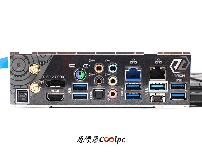 先看I/O部分,這個分布看起來滿特殊的,音源裝置設置在正中間,不過真要說值得一提的部分是具備USB 3.2 Gen2x2 Type-C(20Gb/s)接孔、2.5Gigabit+1Gigabit雙網路孔設計,無線網卡使用最新Wi-Fi 6 802.11ax規格,雙天線設計!