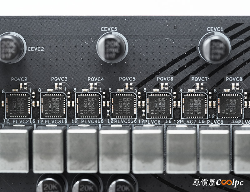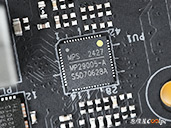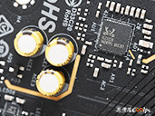 (點小圖放大)卸下散熱裝甲可以看到內側有導熱膠墊(連無線網卡都有),Z890 Riptide WiFi使用伺服器級低損耗PCB板,加入2oz銅製PCB穩定信號,20K長效電容,18+1+1+1相供電。搭載一顆Z890晶片,MP29005-A PWM主控晶片,NUVOTON NCT6686D環控晶片,ALC1220音效晶片,WiFi 7網卡 Intel BE200NGW(320MHz, 4096QAM, 5.8Gbps),其餘晶片可以參考小圖。