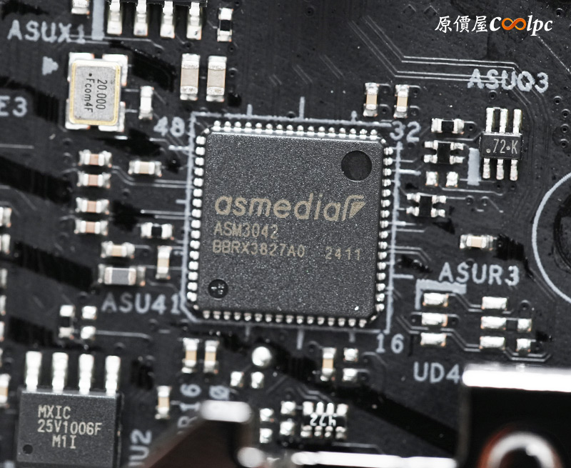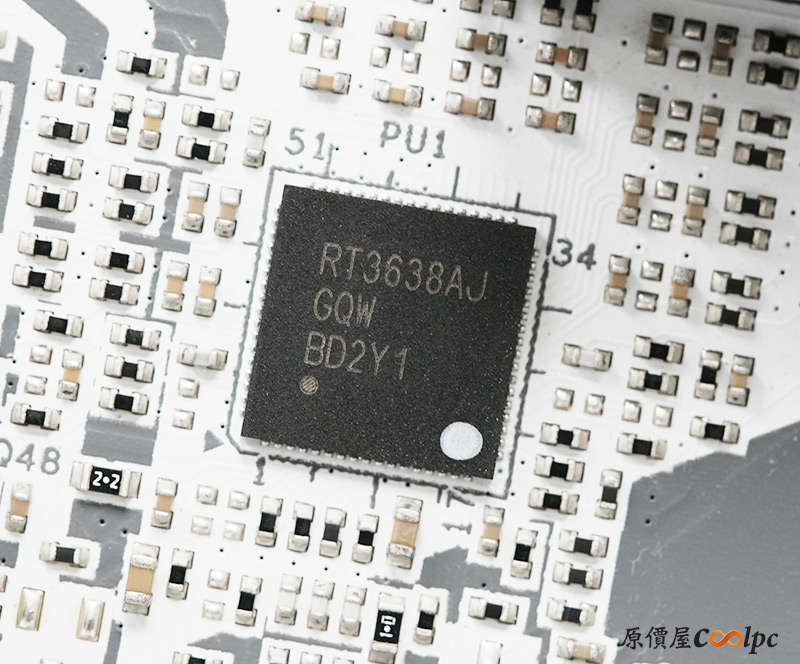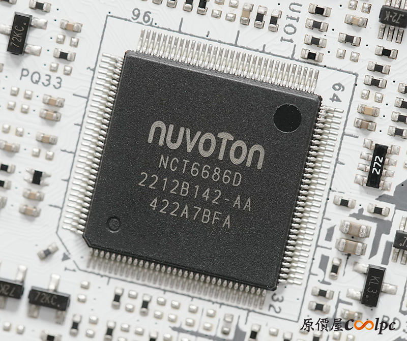 (點小圖放大)散熱裝甲內都有導熱膠墊輔助散熱,Z890 PRO RS WiFi White使用1000uF耐久電容,提供16+1+1+1相供電,並用上2oz銅製PCB製作。主板配備一顆Z890晶片,RT3638AJ PWM主控晶片,NUVOTON NCT6686D環控晶片,Realtek ALC897音效晶片,WiFi 6E網卡Intel AX211NGW,其他晶片同樣放在小圖中供有興趣的玩家參考囉。