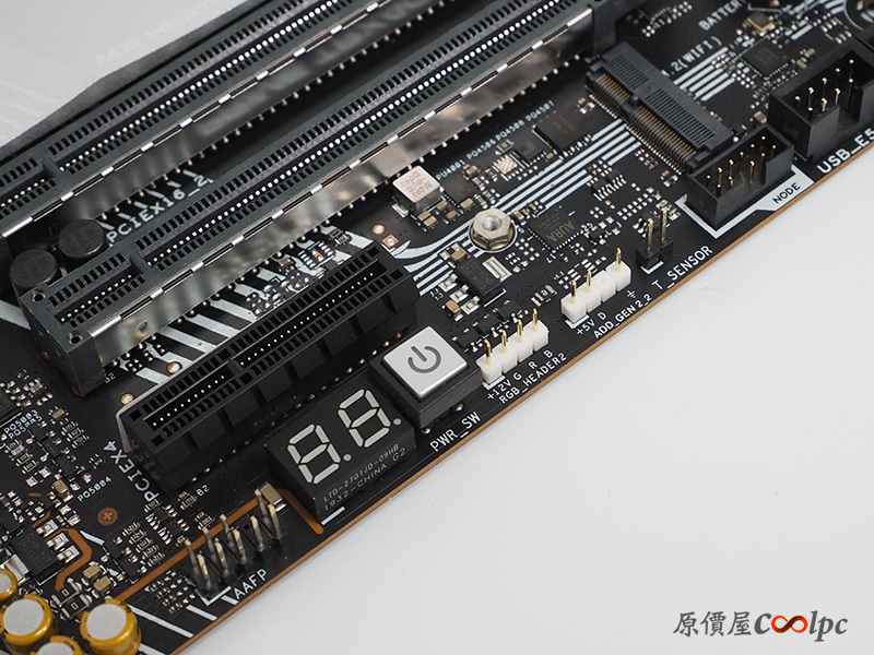 主機板下緣配有獨立電源開關,Q Code DeBug LED,12V RGB及5V ARGB 燈條擴充插座,另外在上方也有個M.2 E Key WIFI網卡擴充插槽。