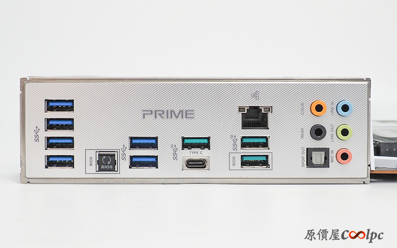 一旁也配有I/O 遮罩,不過由於Mosfet 都集中在主機板上緣的關係,這邊的I/O 遮罩採用的是塑膠材質,而在Logo 字樣部分則支援AURA SYNC 燈效。