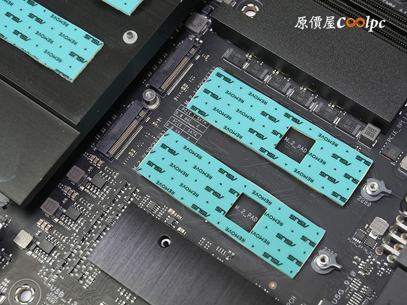 (點小圖放大)華碩 Pro WS TRX50-SAGE WIFI 主機板你要說低調它也是真的很低調了,畢竟現在一堆中高階板子不是 ROG logo、特殊造型散熱片、就是整合 OLED 資訊面板,今天這塊僅用簡單的銀/黑色系散熱器作為主視覺,且看它散熱設計涵蓋 Mosfet、M.2、Chipset、ethernet 各大區塊就知道…工作站級別的平台不討論光鮮亮麗的外表,只注重實用性、散熱、穩定性,鰭片凹槽的造型其實還滿像它們家的新 case-ProArt PA602 面板的風格,既低調又給人成熟穩重的神秘感。