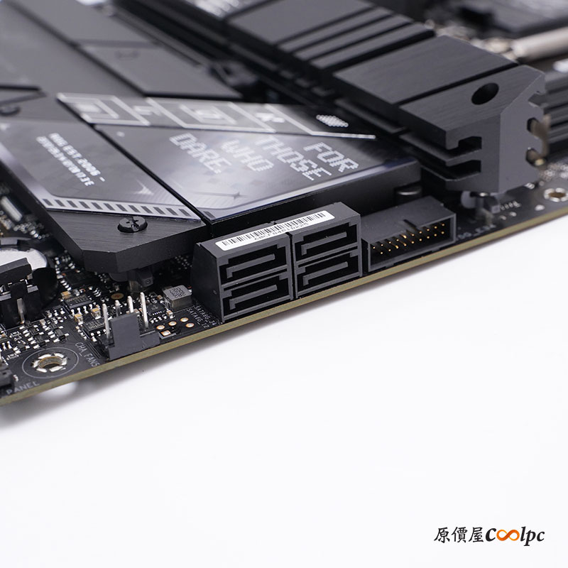 主機板右邊插槽大部分皆採用側插設計,只有機殼前置 USB3.2 Gen2/ USB3.2 Gen2x2 插槽朝上,玩家也不用擔心不知道那些插槽是什麼功用,因為頂部的裝甲有寫上插槽名稱,提供 4 個 SATA 6Gb/s 介面,主機板最下方還有許多超頻玩家使用的開關按鈕。