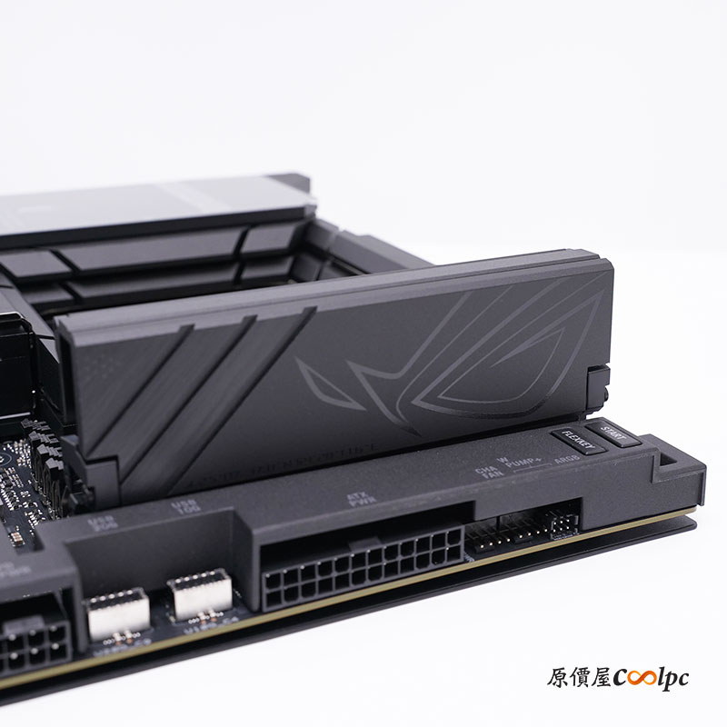 提供 4+2 個 M.2 插槽,四個為 PCIe 5.0 x4 通道,正反面皆有散熱導熱膠,最底下的兩個 PCIe 5.0 通道與第二組 PCIe x 16 共用通道,如果裝置會裝好裝滿的玩家請留意一下配置,並且還有 M.2 Q-Latch 快拆;另外兩個 M.2 插槽就是剛剛提到的 ROG Q-DIMM.2 模組,裡面的PCB正反各可安裝個一個 Gen4 M.2 SSD