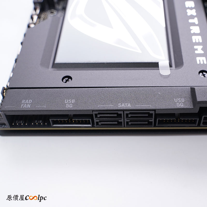 這張的 M.2 散熱器的造型我個人非常喜歡,充滿電競風格的元素,而且還是採用斜切面高低差的造型,多少都能加強散熱效果。