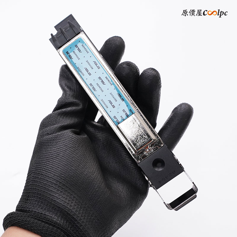 ROG Q-DIMM.2 模組外觀採用磨砂材質搭配部分髮絲紋路設計,搭配上 ROG 敗家之眼點綴,老實說還蠻有質感的!而且連這個模組都加入了快拆設計,左右兩邊的勾勾往上推,就能把散熱片打開了,整個過程都不需要用到螺絲起子,真的不錯!