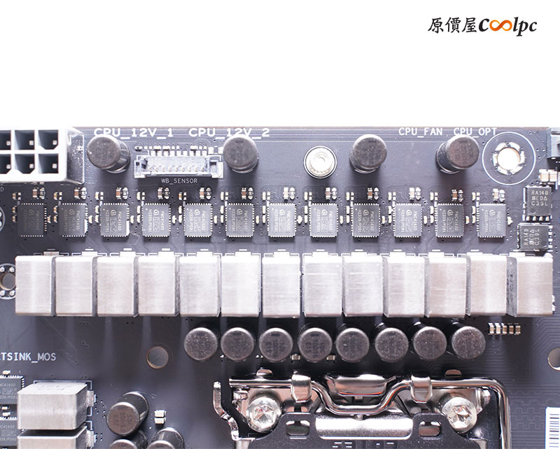 CPU 供電採用 8+8 Pin 實心針腳設計,旁邊還有一個 WB_Sensor 插槽,給 CPU 開放式水冷套件使用。