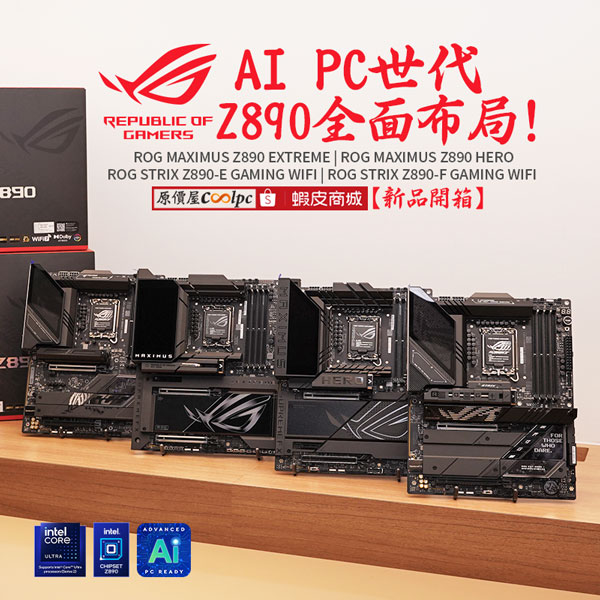 @2024/10/23 ,11:50桌上型電腦處理器終於也有 NPU AI 運算單元啦!讓玩家也可以透過 CPU 的算力來跑一些本地端 AI 應用,確保個人或公司資料隱私不會外流,甚至還能透過軟體配上視訊鏡頭來偵測臉部動作,你只要擠眉弄眼就可以觸發快捷鍵來完成事項!想要體驗這些全新的功能,還是得換上新的平台啦!想要嘗鮮的朋友趕緊手刀預購,數量有限送完為止!首發 Z890 晶片主機板,用料和擴充可以說是誠意滿滿啊!像是華碩的 ROG MAXIMUS Z890 EXTREME 旗艦等級的主機板,搭載 24+1+2+2 相數位供電設計,加上極限超頻玩家必備快捷按鈕和測量電壓,記憶體還有獨家 NitroPath DRAM 更短金手指優化信號技術,搭配上專有 DIMM FIT、AEMP III 功能,來滿足 CPU 和 RAM 超頻所需!並且加入 2 個全新 Thunderbolt 5 (120Gbps) 傳輸介面,還有 3 個PCIe5.0 x4 高速 M.2擴充插槽,拿來當吃飯的工具也很適合!還有超級友善的 M.2 Q-Release、M.2 Q-Slide、M.2 Q-Latch 、PCIe Q-Release Slim 快拆設計,不用螺絲起子就能快速更換 SSD 和顯卡裝置,這對 DIY 新手和老手來說是一大福音啊!而且I/O旁邊還有一個 5 吋可移動的 LCD 螢幕,可以讓你放自己喜歡的圖案或是硬體即時資訊,添加使用電腦的樂趣,不多說啦!讓我們一起來看看 Z890 系列主機板開箱。
