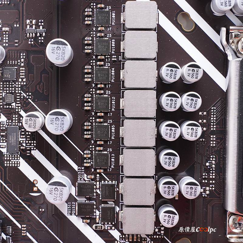 採用14+1相供電設計,PWM控制器為ASP2100、DrMOS SIC659、HDMI控制晶片ASM1442K、USB3.2 Gen2x2 Type-C晶片Reltek RTS5463、USB3.2 Gen2 Type-C 晶片ITE8851、USB3.2 Gen2 晶片GL9901、Intek 2.5G 晶片I225-V、USB Gen1 晶片 ASM1074、音效晶片Realtek 7.1ch Audio CODEC,支援DTS Audio、Two-Way AI Noise Cancelation音效技術、Wi-Fi 6 晶片intel AX201NGW。