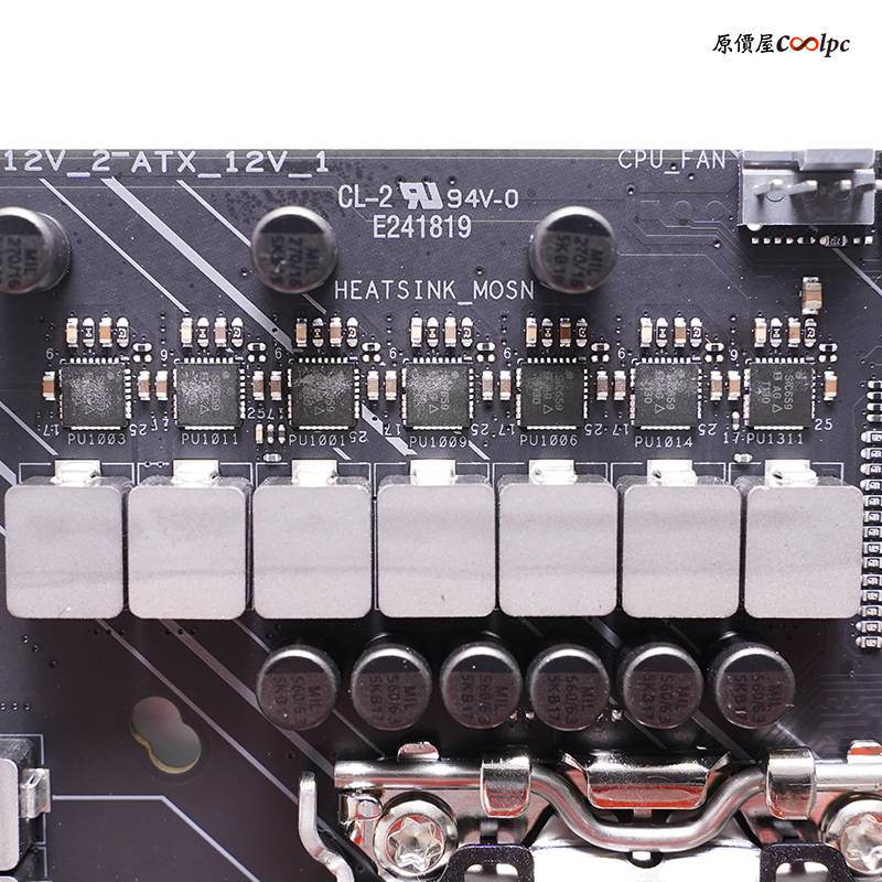 拆掉厚實的散熱片內部用料的部分,採用16+1相供電設計,PWM控制器為ASP2100、DrMOS SIC659、HDMI控制晶片PS8209A、DP控制晶片GL9904、USB3.2 Gen2x2 Type-C晶片Reltek RTS5463、Intek 2.5G 晶片I225-V、USB3.2 Gen2 晶片PI3EQX1004、USB Gen1 晶片 ASM1074、USB3.2 Gen2 Type-C 晶片 ASM1543、音效晶片Realtek ALC4080 + Savitech SV3H712 AMP放大器,支援Sonuc Studio III + Sonic Studio Virtual Mixer、Sonic Rader III、DTS Sound Unbound、Two-Way AI Noise Cancelation音效技術。