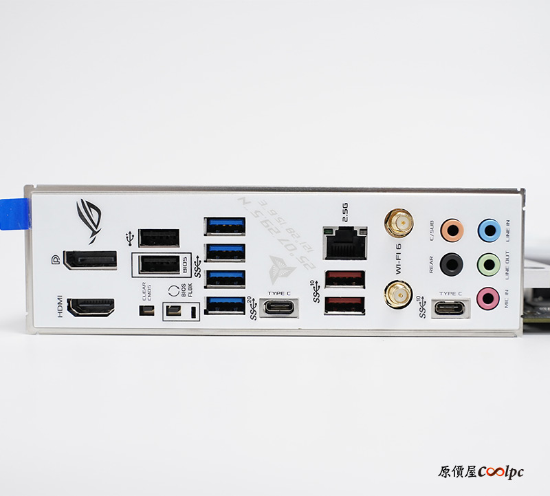 I/O的部分則是有HDMI 2.1、DisplayPort 1.4、Clear CMOS Button、BIOS FlashBack Button、2個USB2.0、4個USB3.2 Gen1 Type-A、1個USB3.2 Gen2x2(20Gbps) Type-C、2個USB3.2 Gen2 Type-A 、2.5Gb網路插槽、Intel Wi-Fi 6、1個USB3.2 Gen2 Type-C、AUDIO音效插槽。
