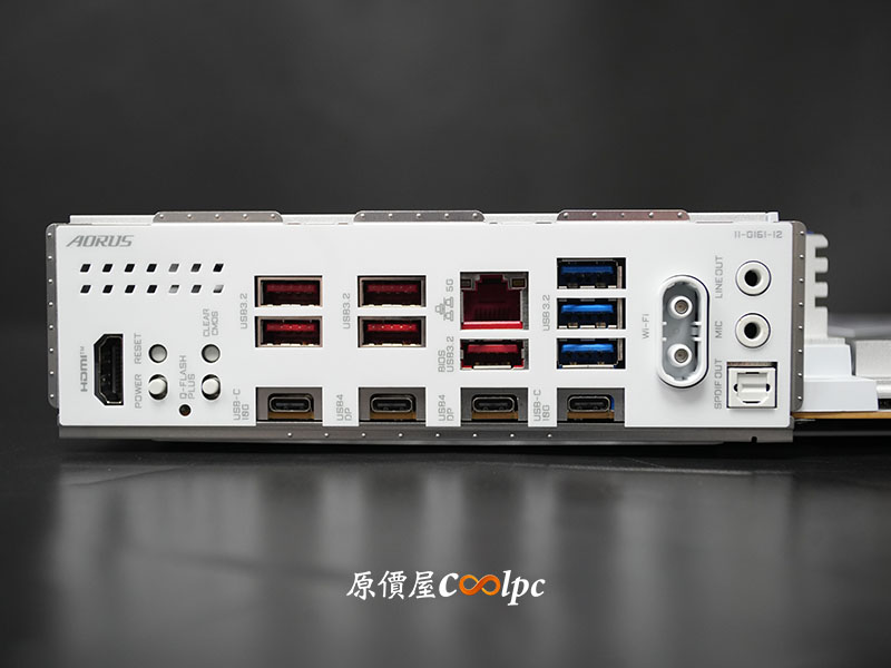 這 I/O 配置不僅高規又豐富,有雙 5G LAN、雙 USB4(40Gbps) 連接埠(DP輸出功能視 CPU 而定),還有 USB 20Gbps(Type-C)、數個 USB 10Gbps 介面、Wi-Fi EZ-Plug 快拆天線。同時整合多個實體功能按鍵(Power、Reset、Q-FLASH PLUS、CLEAR CMOS)。