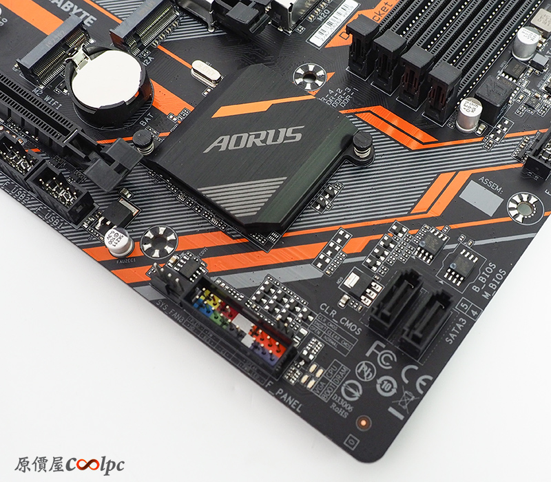 主機板右下角可以看到掛上AORUS 字樣的晶片組散熱片,一旁則有另外兩個SATA 連接埠在主機板右下角加上前面提到的4個SATA 連接埠,這張主機板提供6個SATA 6Gbps連接埠,支援RAID 0/1/5/10 磁碟陣列功能。